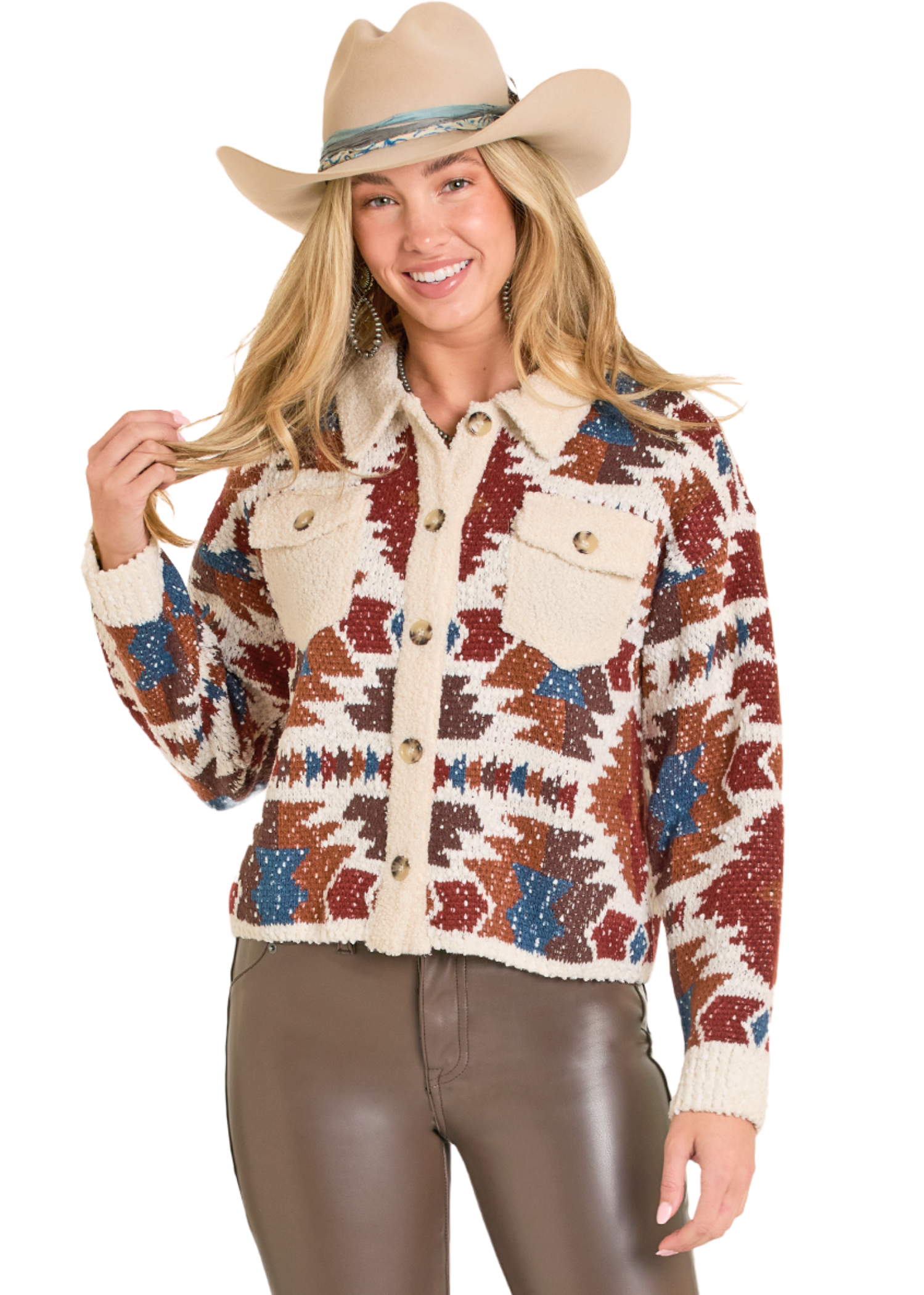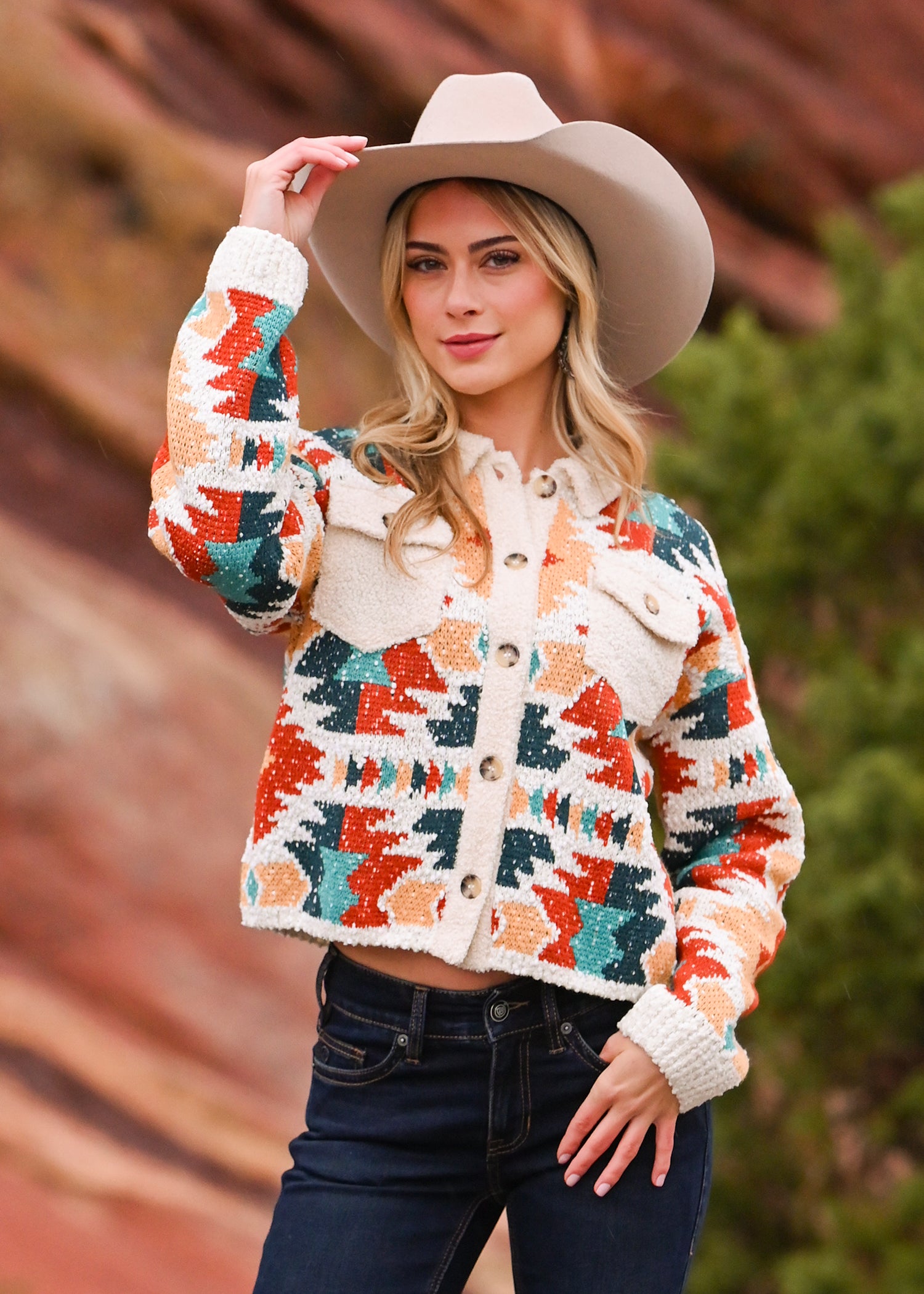 View Aztec Cardigan with Sherpa Trim in Turquoise